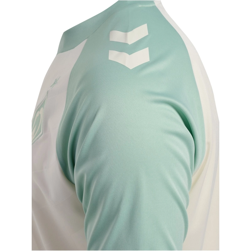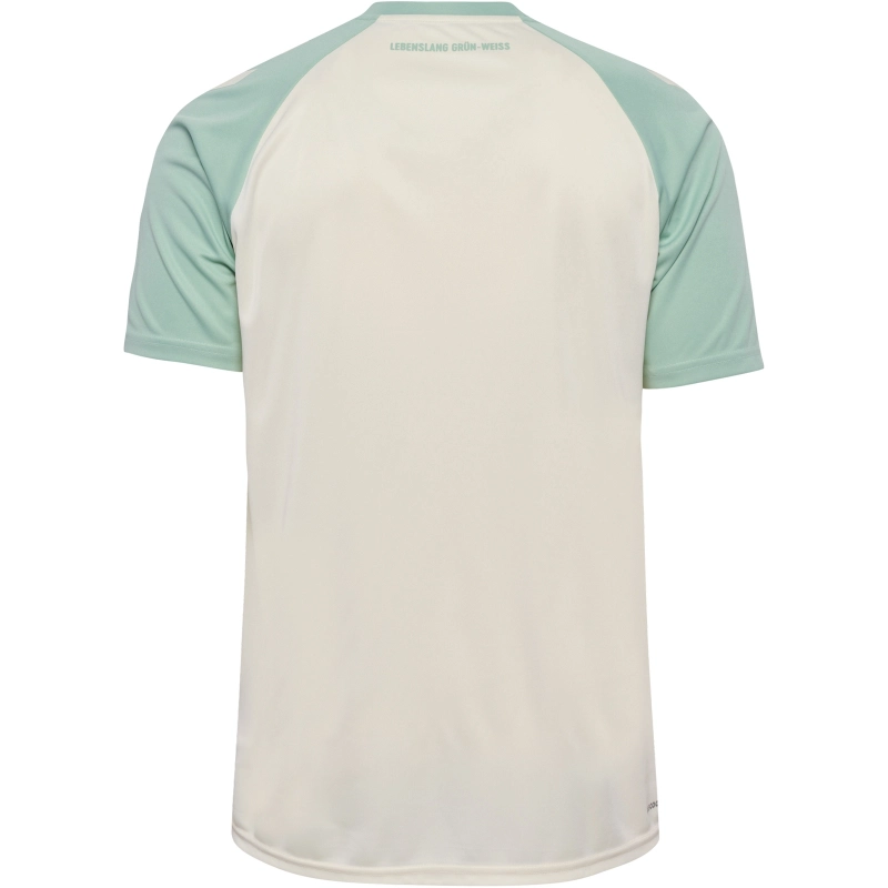 Auf der Rückseite ist wie gewohnt der Vereinsclaim „Lebenslang grün-weiß“ unterhalb des Kragens zu finden. Abgerundet wird das Jersey durch die Raglanärmel in Schilfgrün und die klassischen hummel-Winkel in Offwhite auf den Schultern.